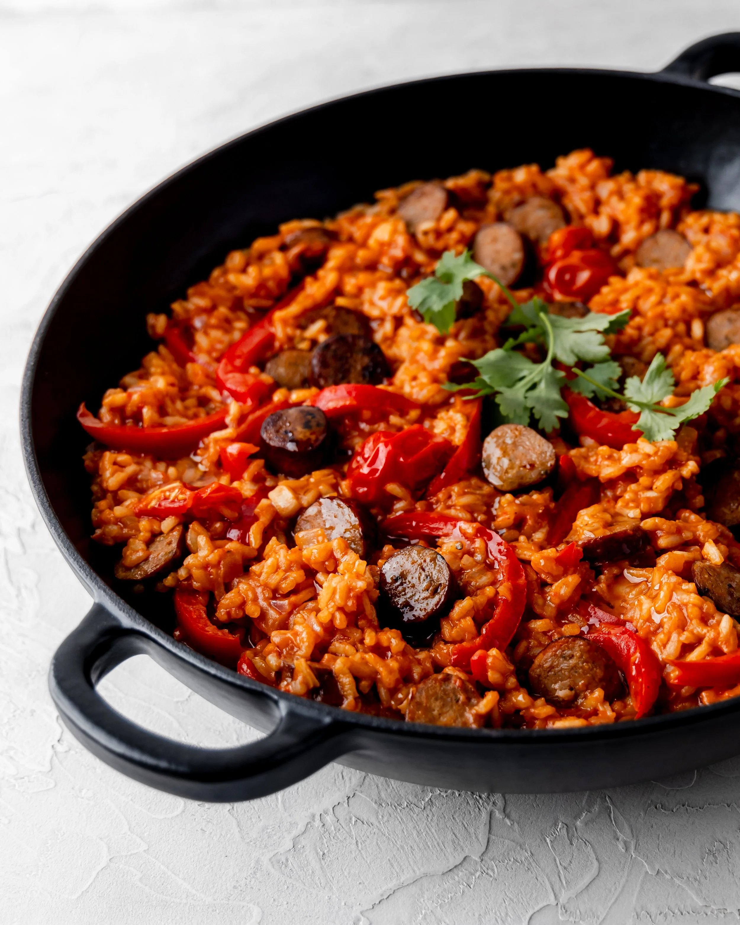 I love a good paella, it instantly transports me back to Spain. This one is easy to whip up with just a few veggies and deliciously browned chorizo.