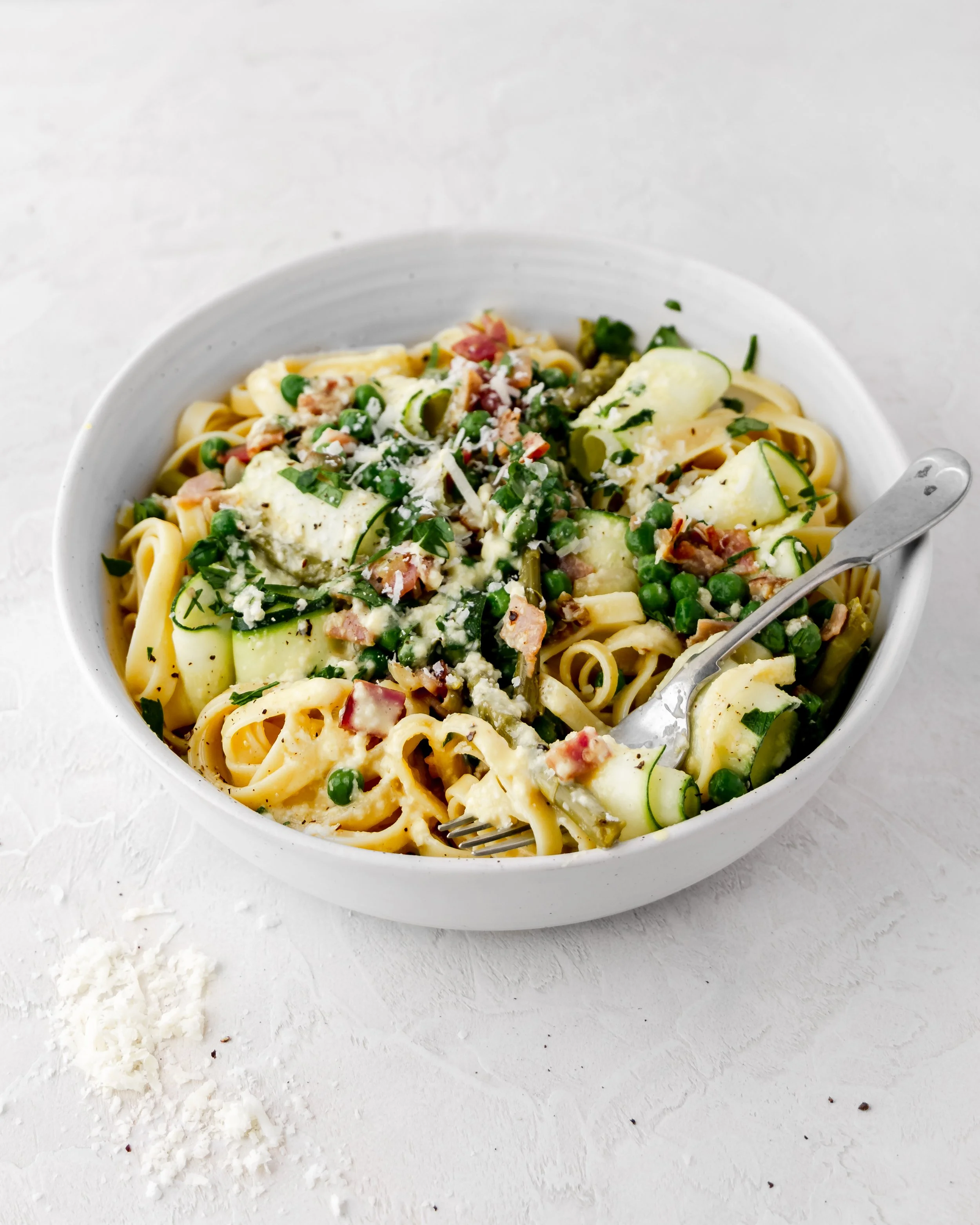 Creamy carbonara elevated with healthy greens paired with crispy bacon. This is such an easy way to add in some extra nutrients, reducing the carbohydrate content in the pasta and using zucchini noodles instead. You hardly notice it, there’s just enough pasta to satisfy any pasta cravings you may have! Enjoy!