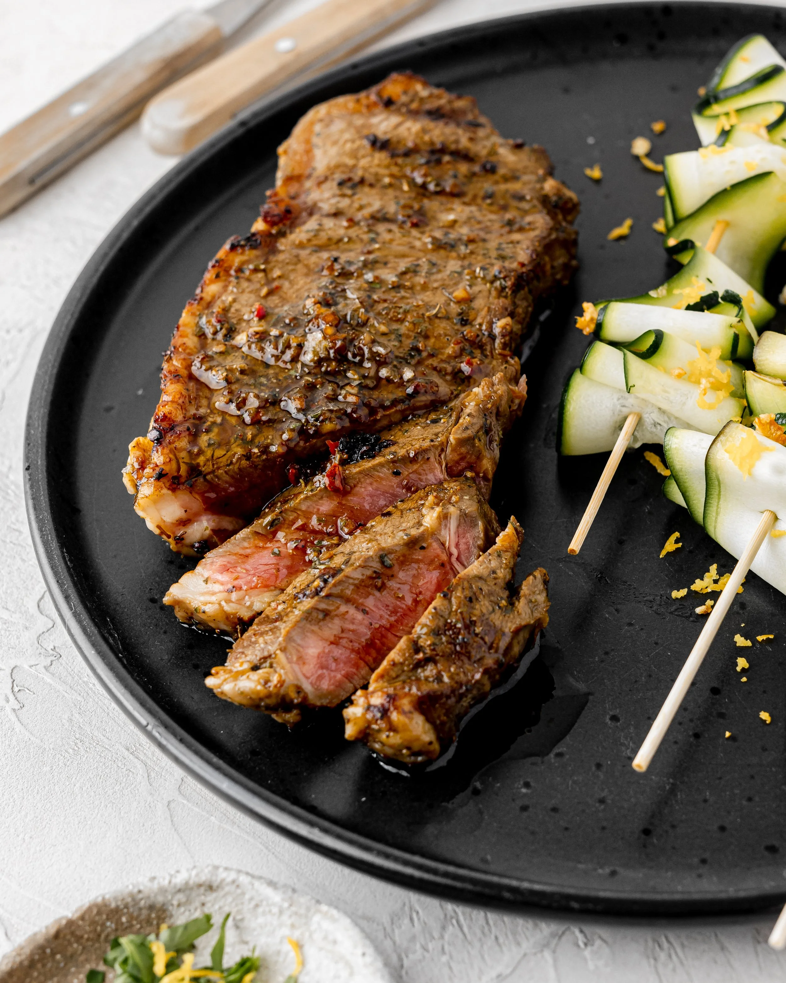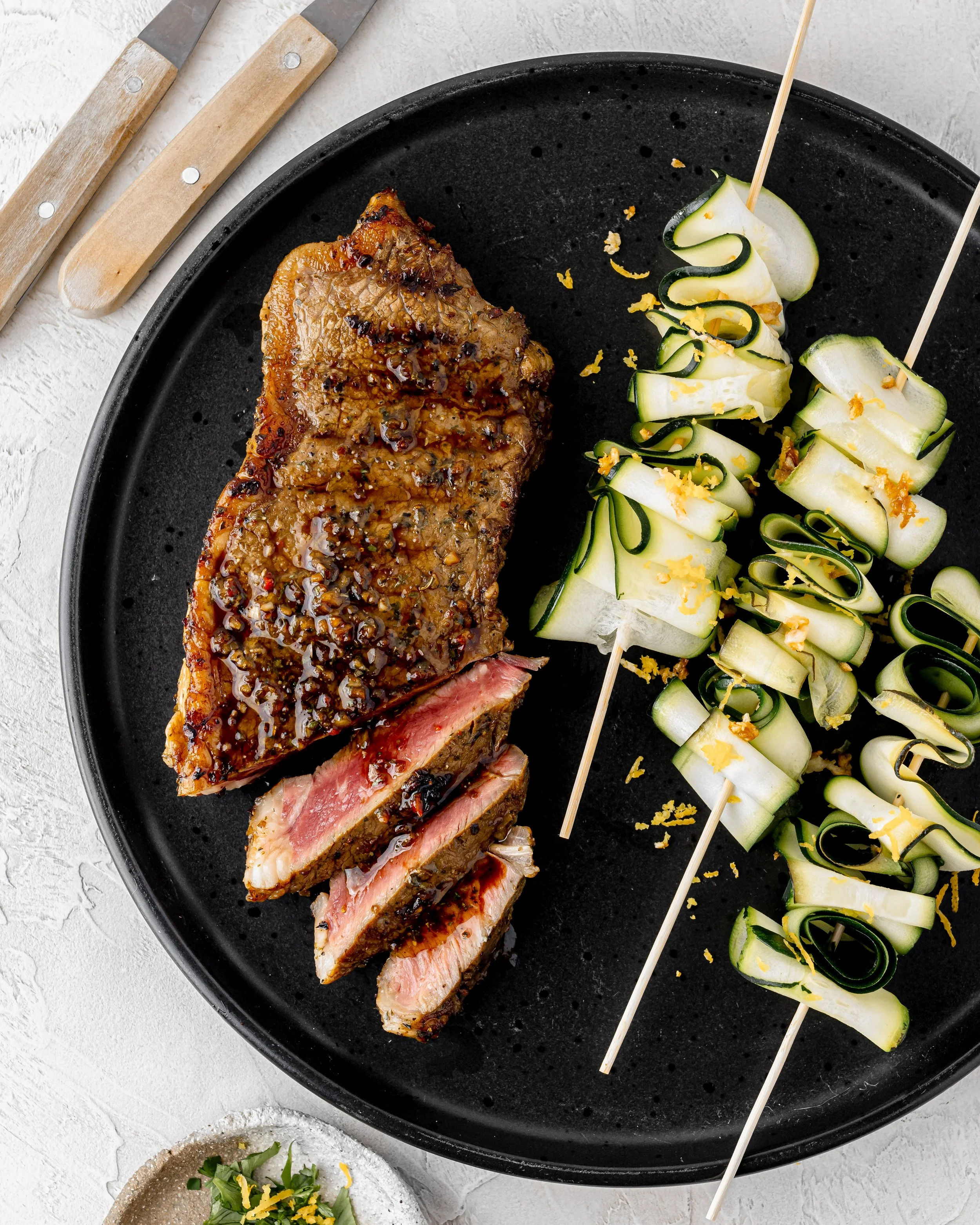 5. Serve marinated steak alongside zucchini ribbon skewers and enjoy!