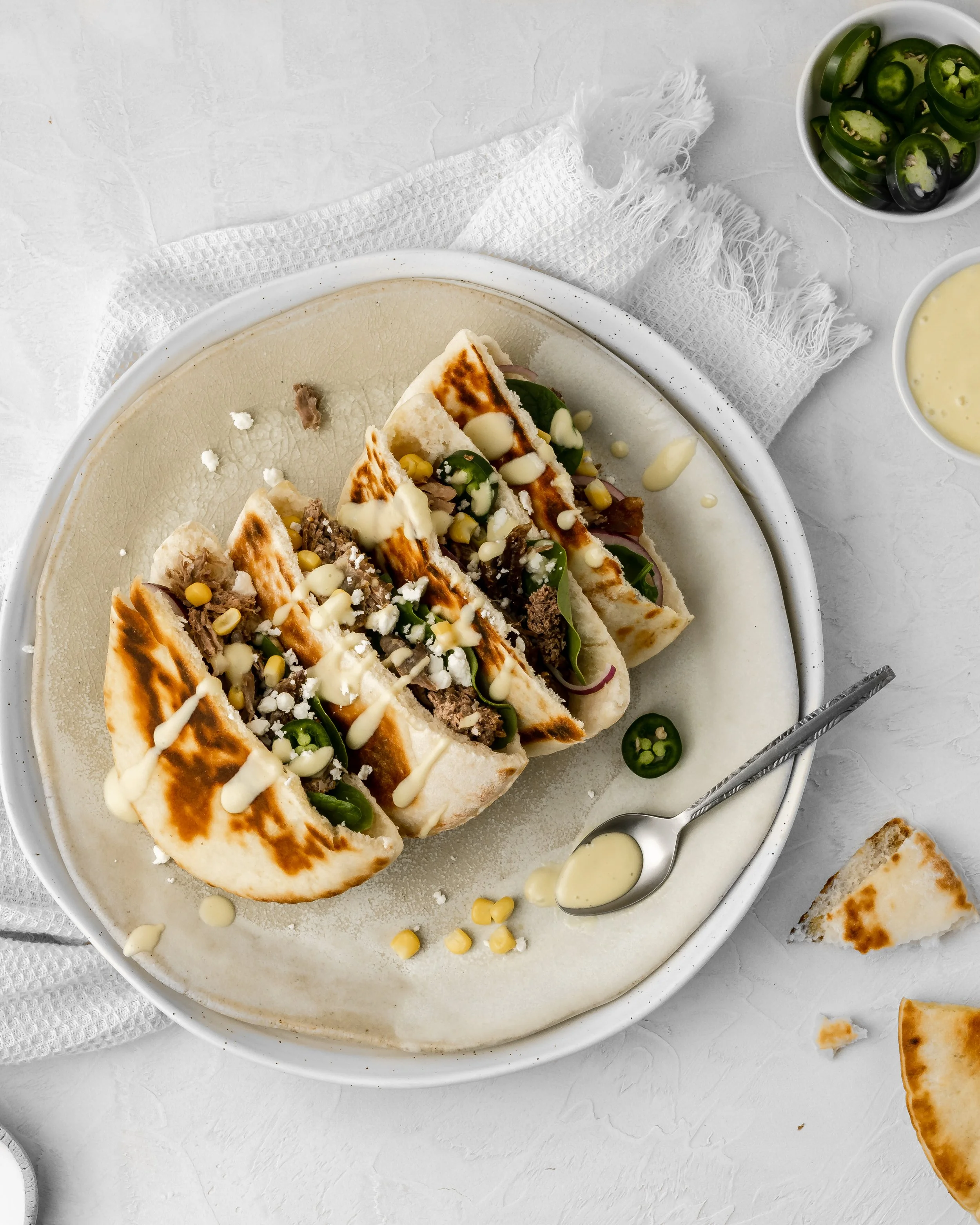 Top wrap with lamb, remaining ingredients and drizzle with garlic sauce.