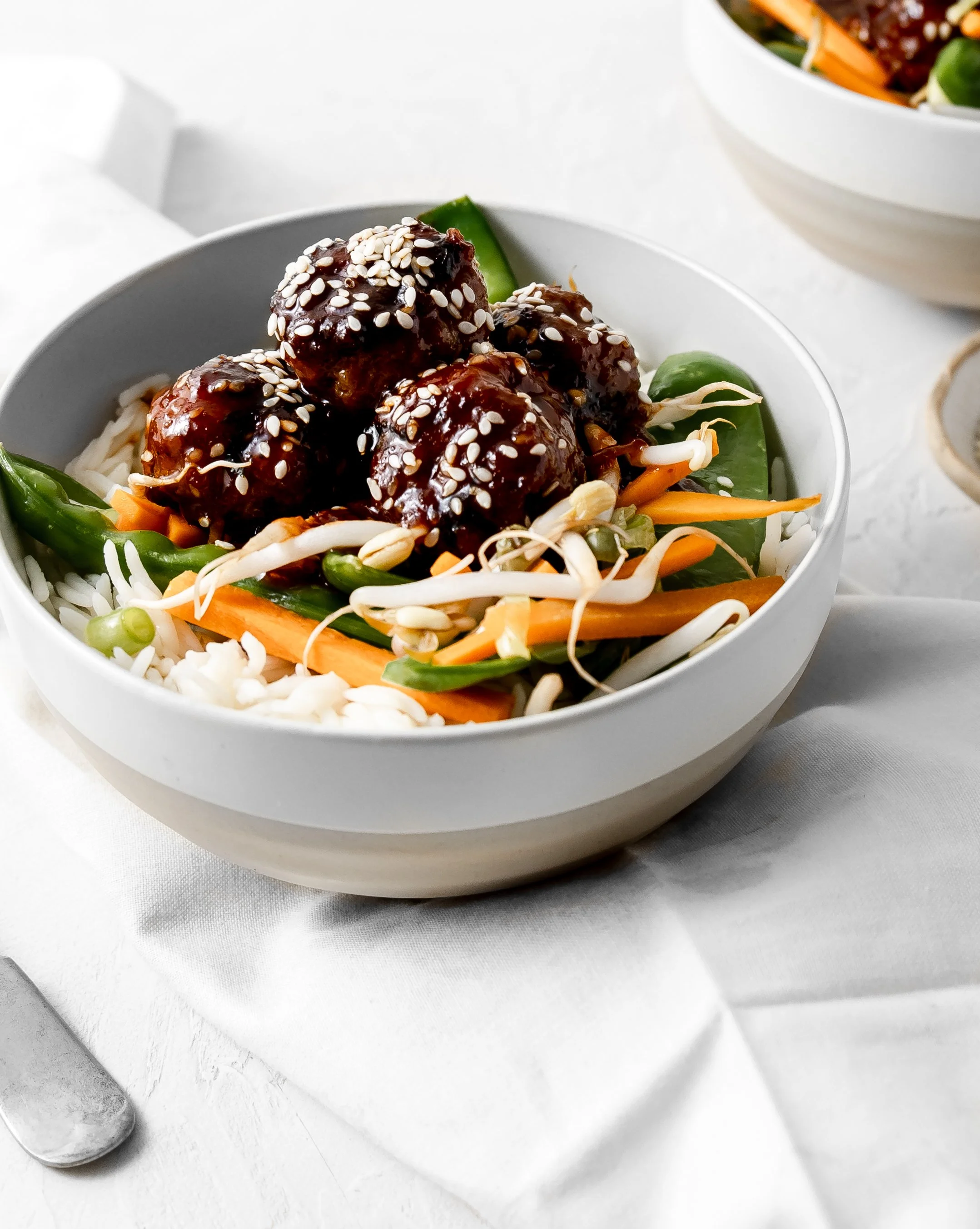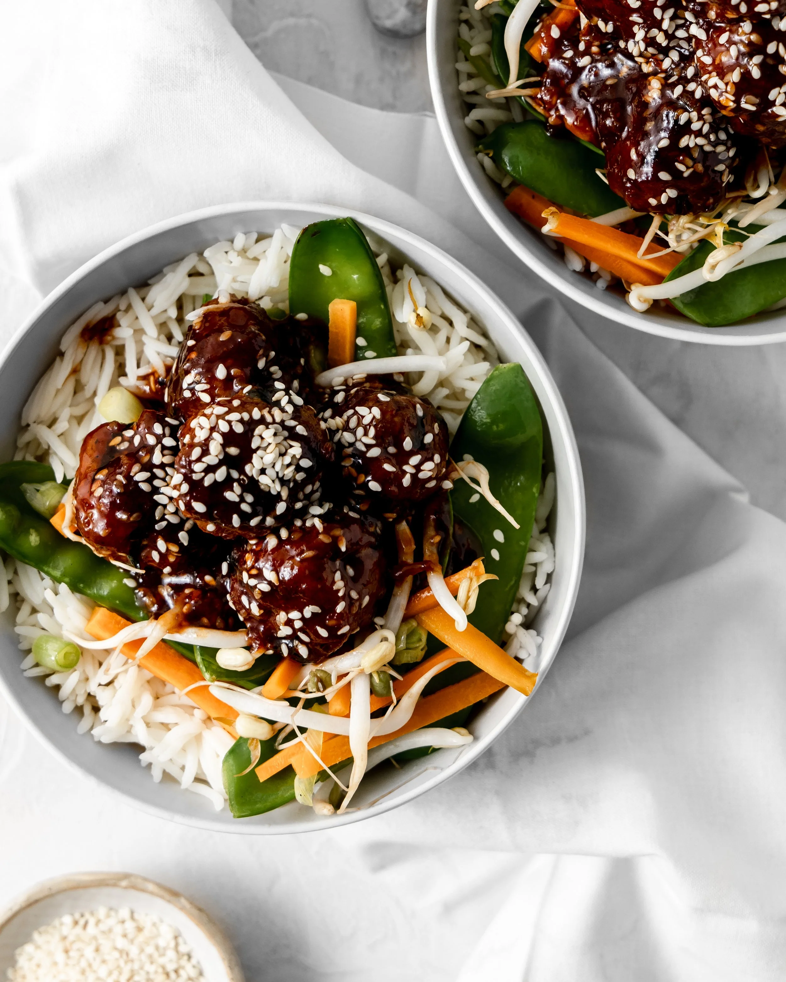 Serve rice topped with sticky meatballs and cooked vegetables.